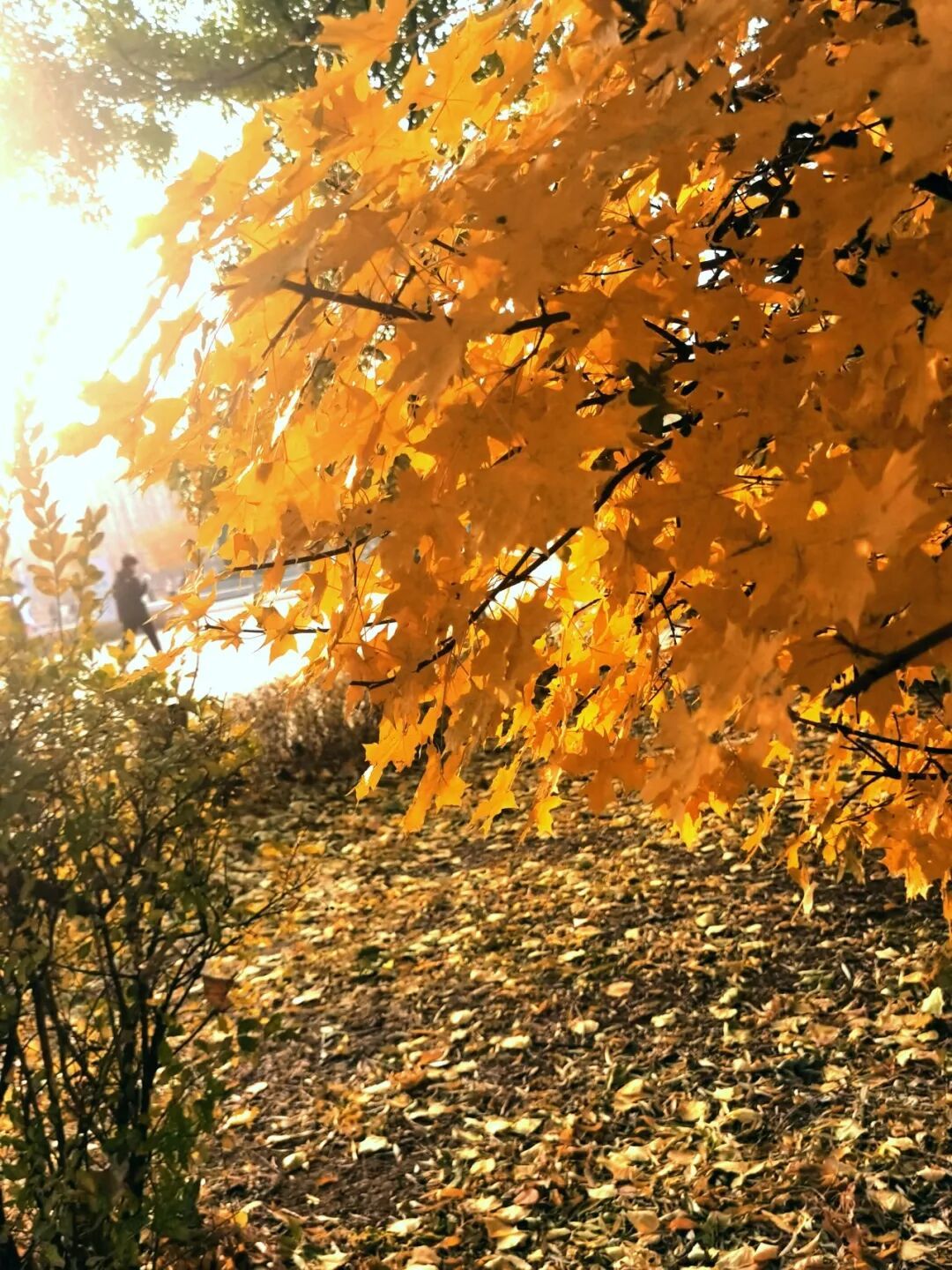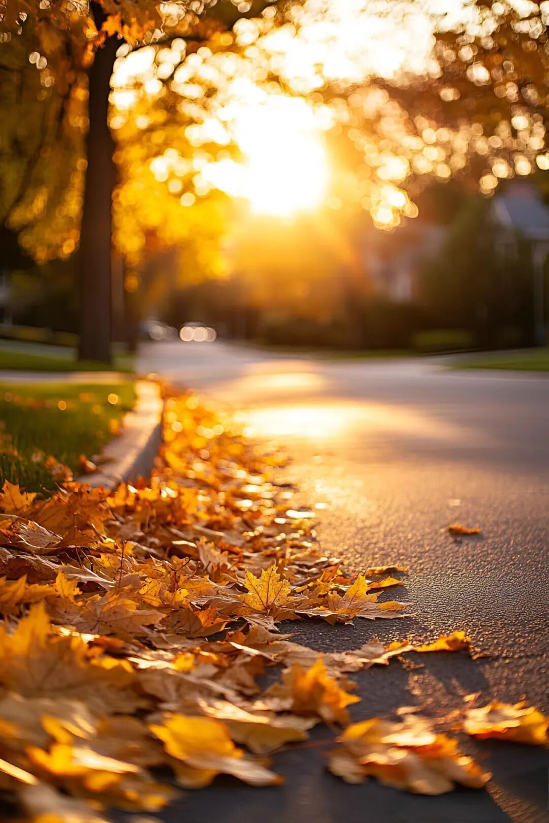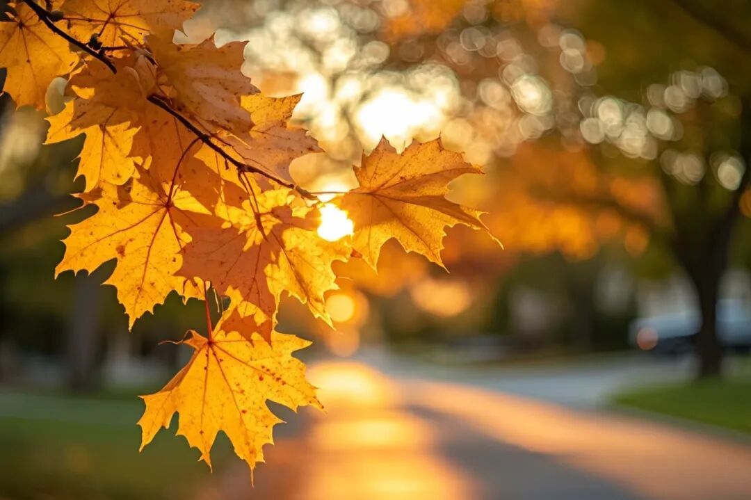 蹲在路沿时,风刚好卷着最后一片叶落在鞋尖——抬眼撞见太阳把秋光揉碎了,金箔似的裹满整条街。脚下是枫色铺就的软毯,每片脉络里都浸着暖调的光,连风掠过的轨迹都泛着蜜色的涟漪。