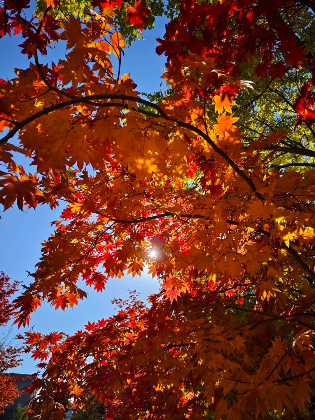 长椅在树影里等风,柳梢裹着碎金晃。那树枫烧得正酣,把秋阳揉进满径落叶——是校园里,连风都慢下来的好时光。